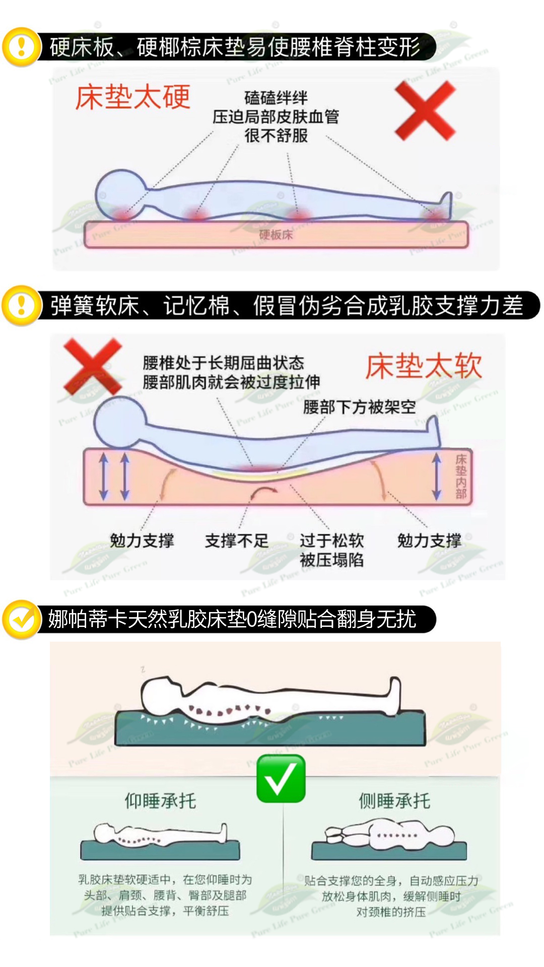 但如果过软的床垫就会使人体平躺和侧躺腰部支撑的受力加大,分散了肩部和臀部的受力;而过硬的床垫如硬板床会使肩背部支撑和臀部支撑的受力加大而造成这两部不舒服,同时由于腰部的支撑不足也会是人体平躺时腰椎的生理前凸减小,侧躺时腰椎呈现侧向弯曲,所以过软和过硬的床垫对腰椎都不好,软硬度适中的床垫比较合适。
